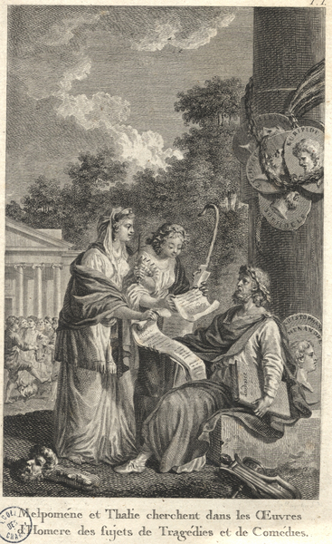 Melomène et Talie cherchent dans les oeuvres d'Homère des sujets de tragédies et de comédies
