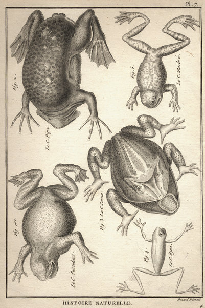 Illustration pour l'Encyclopédie : cinq figures de crapauds