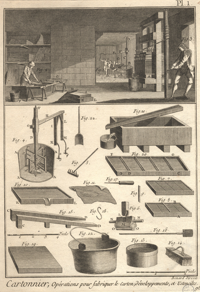 Planche pour l'Encyclopédie : opérations pour fabriquer le carton