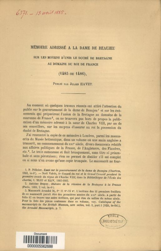 Mémoire adressé à la Dame de Beaujeu sur les moyens d'unir le duché de Bretagne au domaine du roi de France, 1485 ou 1486