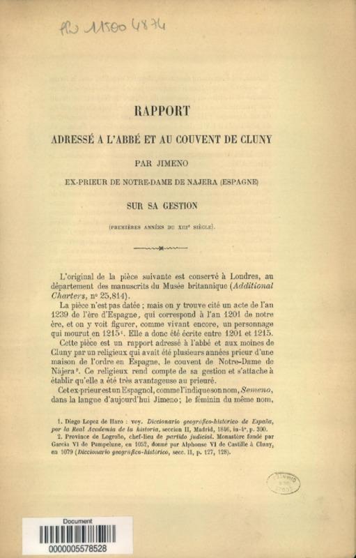 Rapport adressé à l'abbé et au couvent de Cluny par Jimeno, ex-prieur de N.-D. de Najera, Espagne, sur sa gestion, premières années du XIIIe siècle