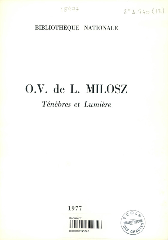 O. V. de L. Milosz : ténèbres et lumière [exposition, Bibliothèque nationale, Paris, 1977]