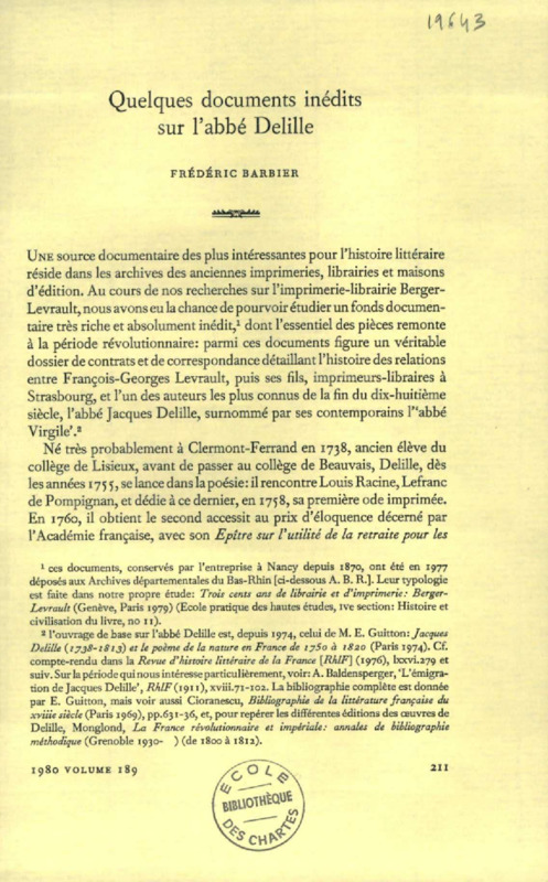 Quelques documents inédits sur l'abbé Delille