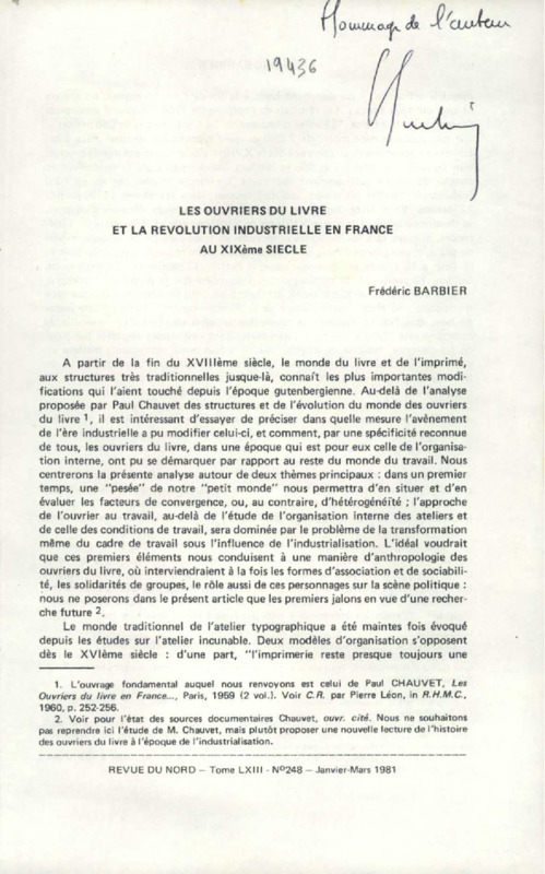 Les ouvriers du livre et la Revolution industrielle en France au XIXème siècle