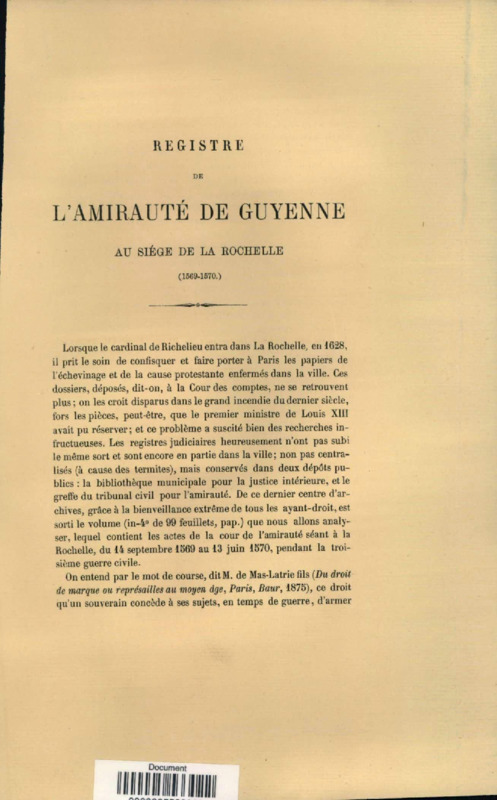 Registre de l'amirauté de Guyenne au siège de la Rochelle : 1569-1570