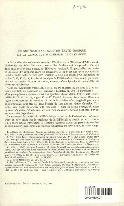 Un Nouveau manuscrit du texte tronqué de la "Chronique" d'Adhémar de Chabannes