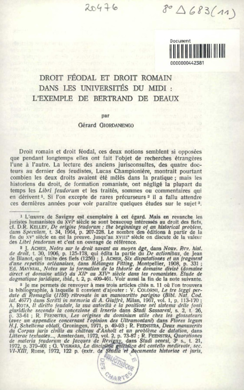 Droit féodal et droit romain dans les universités du Midi : l'exemple de Bertrand de Deaux
