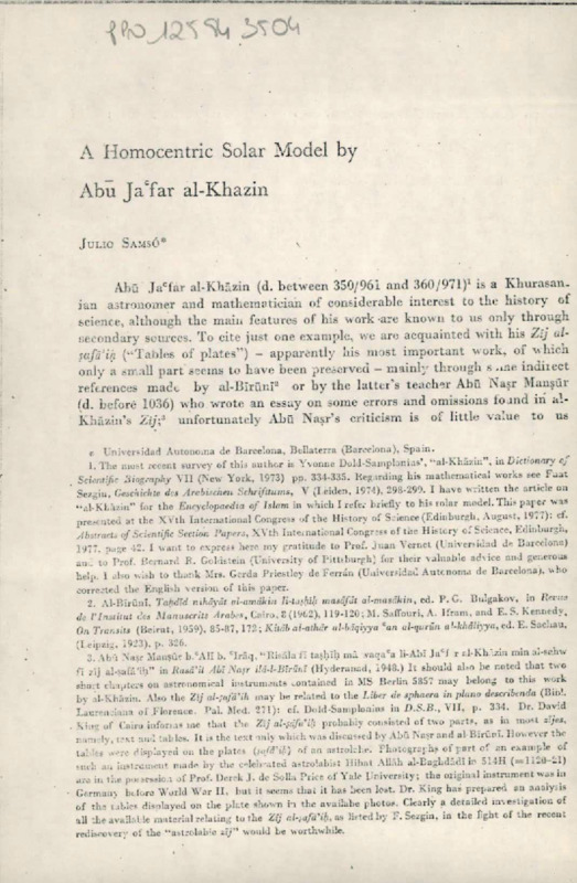 A Homocentric Solar Model by Abu Jafar al-Khazin