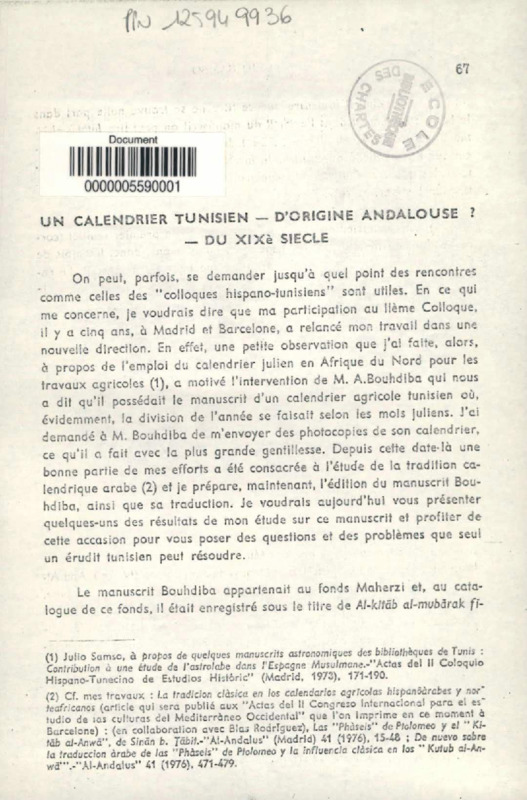 Un calendrier tunisien, d'origine andalouse? du XIXe siècle