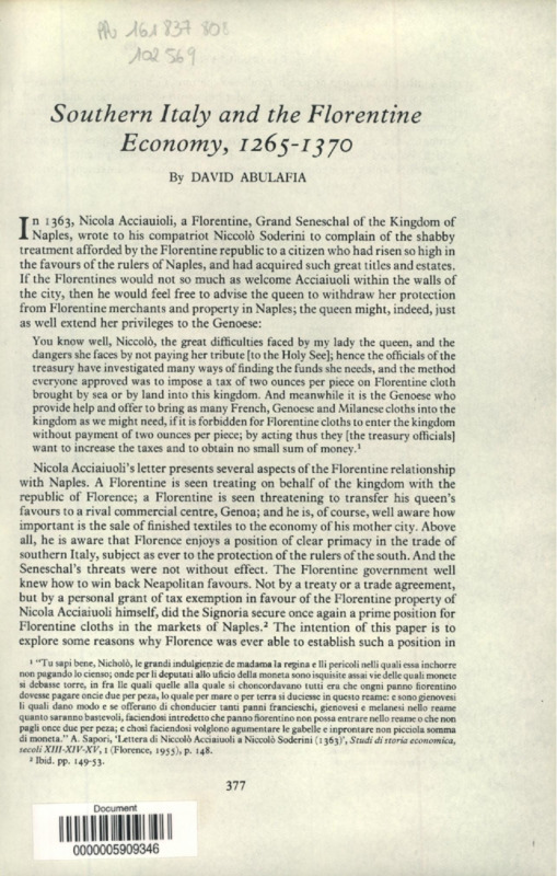Southern Italy and the Florentine Economy, 1265-1370
