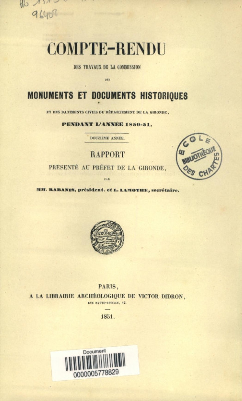 Compte-rendu des travaux de la Commission des monuments et documents historiques et des bâtiments civils du département de la Gironde, pendant l'année 1850-1851 : rapport présenté au Préfet de la Gironde