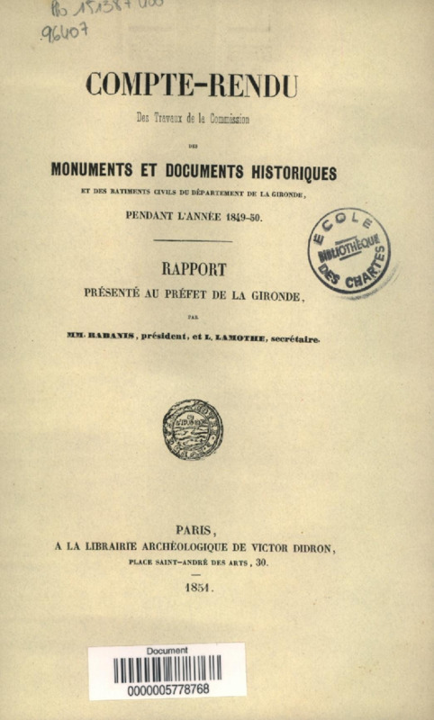 Compte-rendu des travaux de la Commission des monuments et documents historiques et des bâtiments civils du département de la Gironde, pendant l'année 1849-1850 : rapport présenté au Préfet de la Gironde