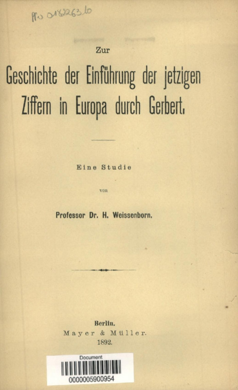 Zur Geschichte der Einführung der jetzigen Ziffern in Europa durch Gerbert : eine Studie