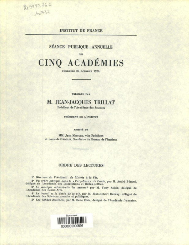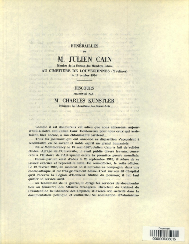 Funérailles de M. Julien Cain...au cimetière de Louveciennes (Yvelines) le 12 octobre 1974 : discours