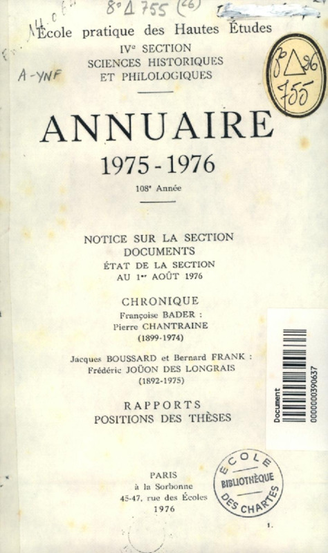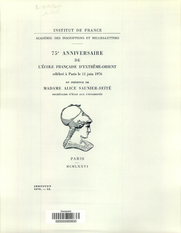 75e anniversaire de l'École française d'Extrême-Orient : célébré à Paris le 11 juin 1976 en présence de Madame Alice Saunier-Seïté,...