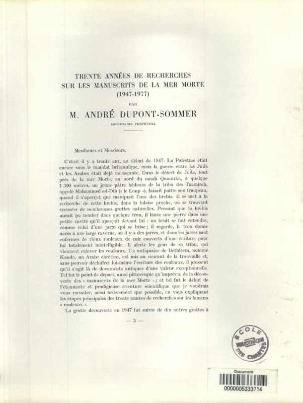 Trente années de recherches sur les manuscrits de la mer morte (1947-1977) : lecture faite dans la séance publique annuelle du 25 novembre 1977