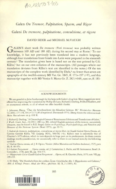 Galen on Tremor, Palpitation, Spasm, and Rigor