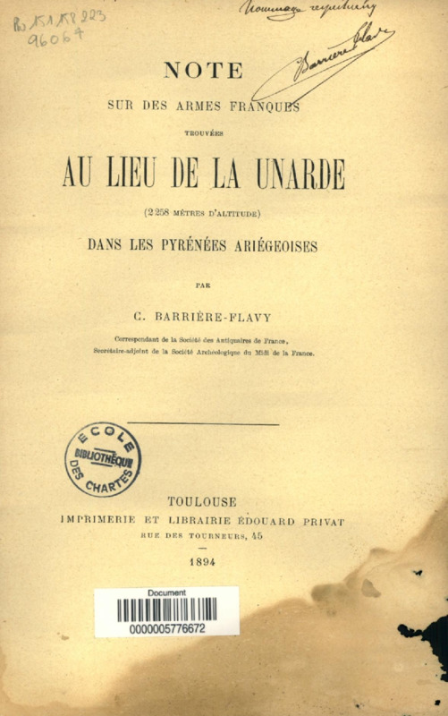 Note sur des armes franques trouvées au lieu de La Unarde, 2258 mètres d'altitude, dans les Pyréenées ariégeoises