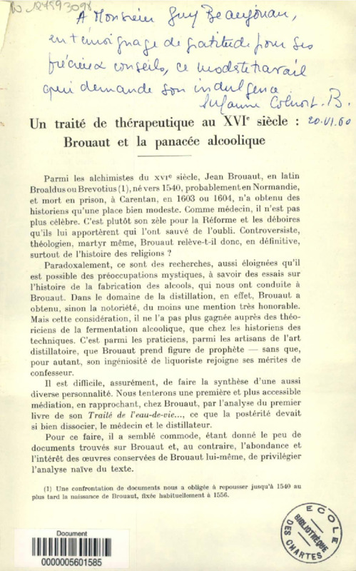 Un traité de thérapeutique au XVIe siècle : Brouaut et la panacée alcoolique