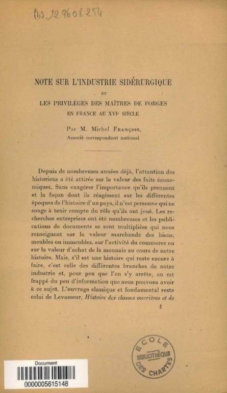 Note sur l'industrie sidérurgique et les privilèges des maîtres de forges en France au XVIe siècle