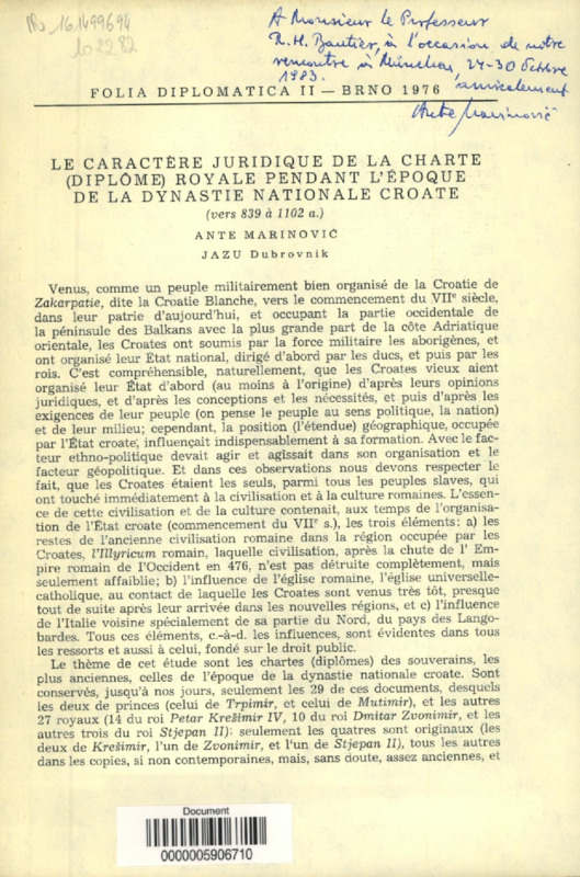 Le caractère juridique de la charte [diplôme] royale pendant l'époque de la Dynastie royale croate, vers 839 à 1102 a.