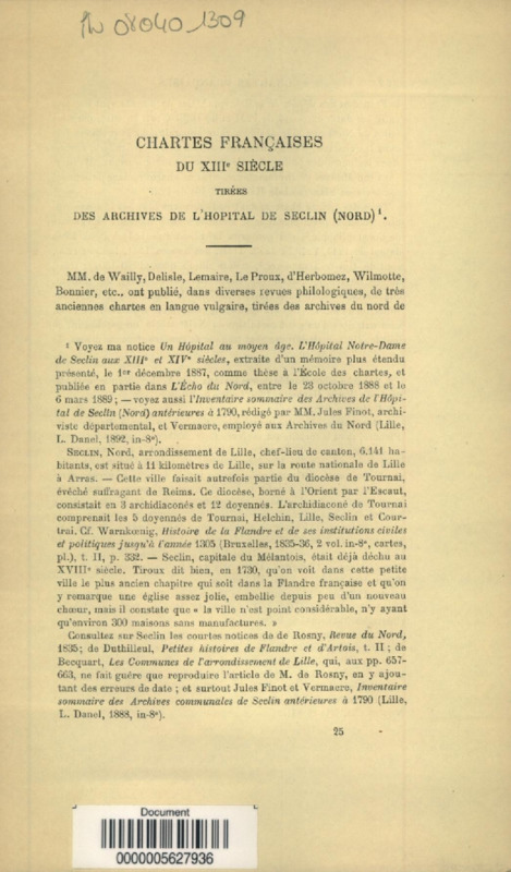 Chartes françaises du XIIIe siècle, tirées des archives de l'hôpital de Seclin, Nord