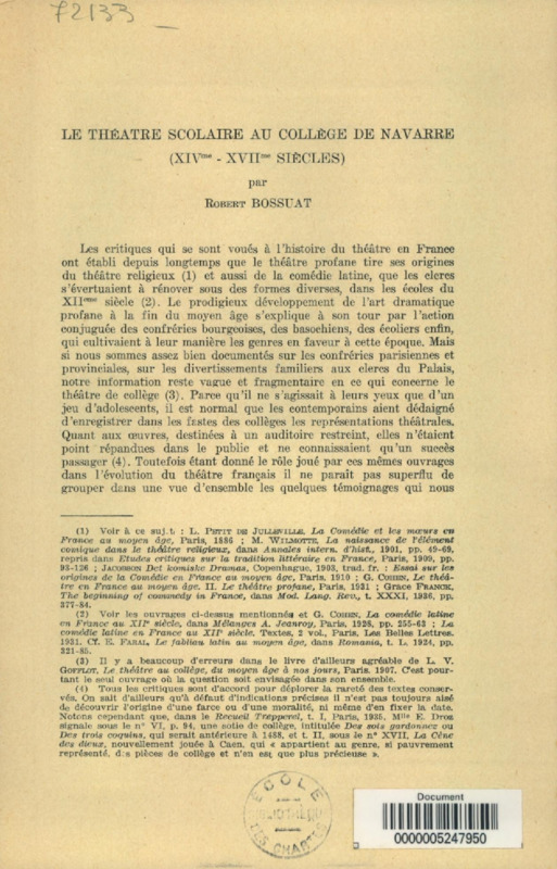 Le théâtre scolaire au collège de Navarre (XIVme-XVIIme siècles)