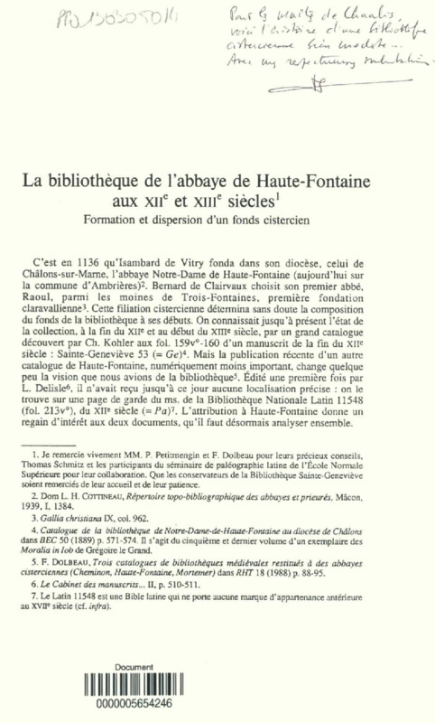 La bibliothèque de l'abbaye de Haute-Fontaine aux XIIe et XIIIe siècles : formation et dispersion d'un fonds cistercien