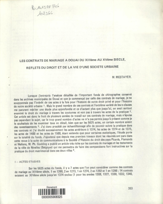 Les contrats de mariages à Douai du XIIIe au XVe siècle : reflets du droit et de la vie d'une société urbaine