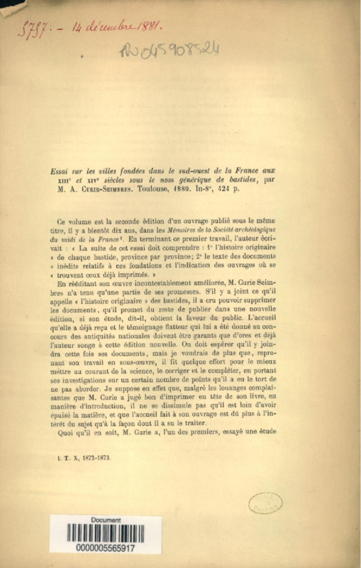 Essai sur les villes fondées dans le sud-ouest de la France aux XIIIe et XIVe siècles sous le nom générique de bastides
