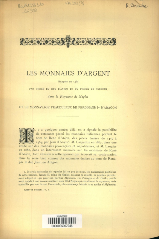 Les monnaies d'argent frappées en 1460 par ordre du duc d'Anjou et du prince de Tarente dans le Royaume de Naples et le monnayage frauduleux de Ferdinand Ier d'Aragon