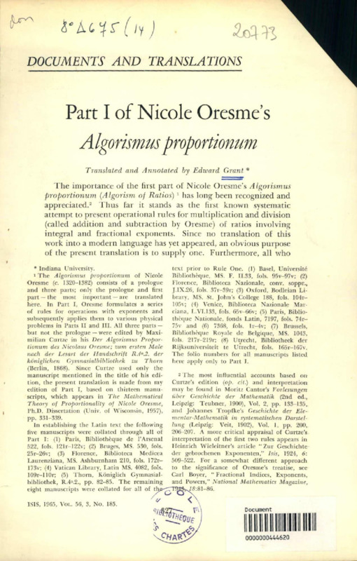 Part 1 of Nicole Oresme's : algorismus proportionum