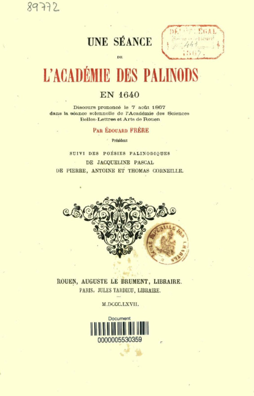 Une séance de l'Académie des Palinods en 1640 : discours prononcé le 7 août 1867 dans la séance solennelle de l'Académie des Sciences, belles-lettres et arts de Rouen