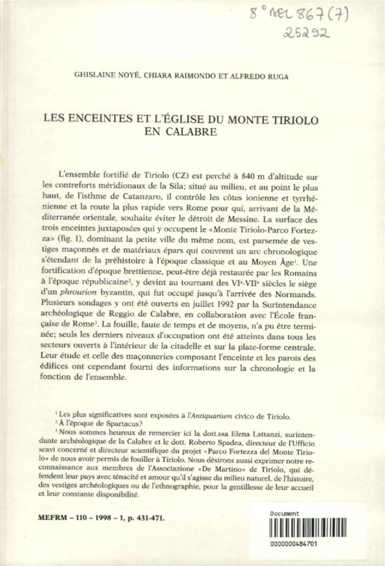 Les enceintes et l'église du Monte Tiriolo en Calabre