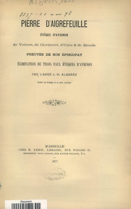 Pierre d'Aigrefeuille, évêque d'Avignon, de Vabres, de Clermont, d'Uzès et de Mende : Preuves de son épiscopat, élimination de trois faux évêques d'Avignon