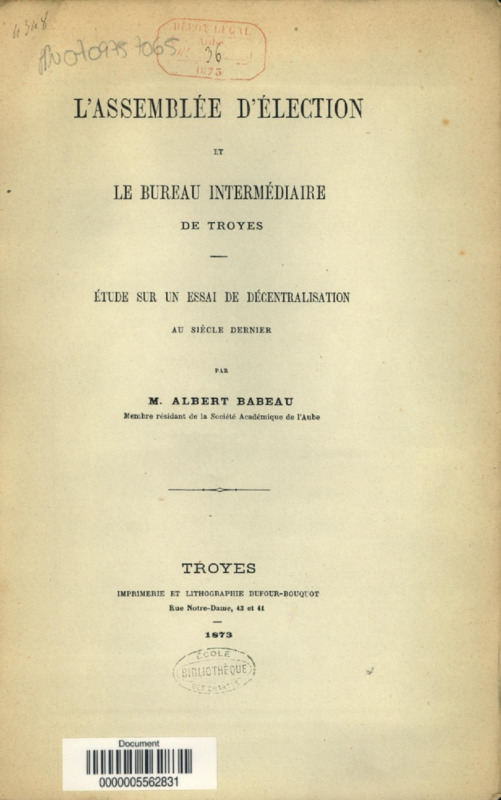 L'Assemblée d'élection et le bureau intermédiaire de Troyes, étude sur un essai de décentralisation au siècle dernier