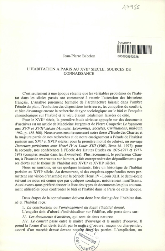 L'habitation à Paris au XVIIe siècle : sources de connaissance