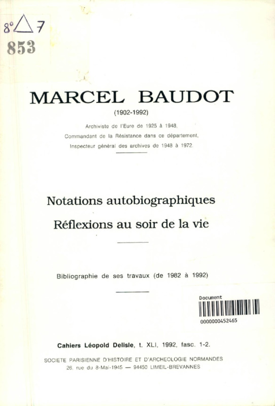 Marcel Baudot [Suivi de] réflexions au soir de la vie, [et] bibliographie de ses travaux ,de 1982 à 1992