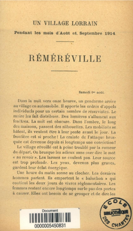 Un village lorrain pendant les mois d'août et septembre 1914 : Réméréville