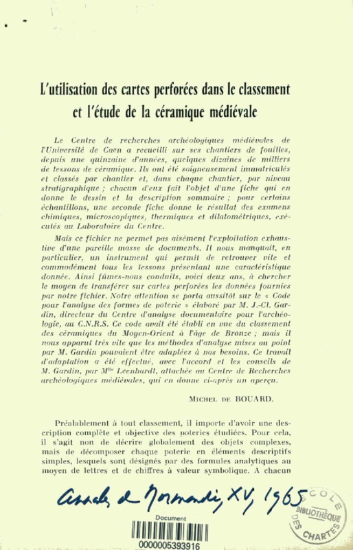 L'utilisation des cartes perforées dans le classement et l'étude de la céramique médiévale
