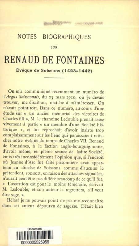 Notes biographiques sur Renaud de Fontaines : évêque de Soissons au temps de Jeanne d'Arc 1423-1442