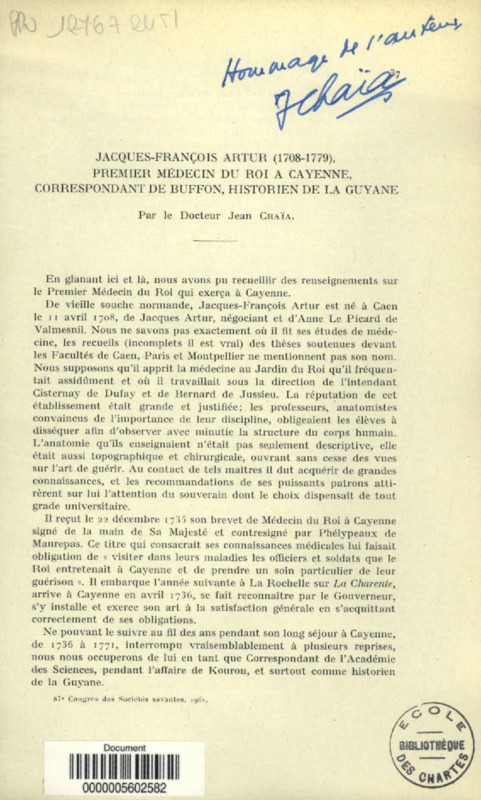 Sur une correspondance inédite de Réaumur avec Artur, premier médecin du Roy à Cayenne