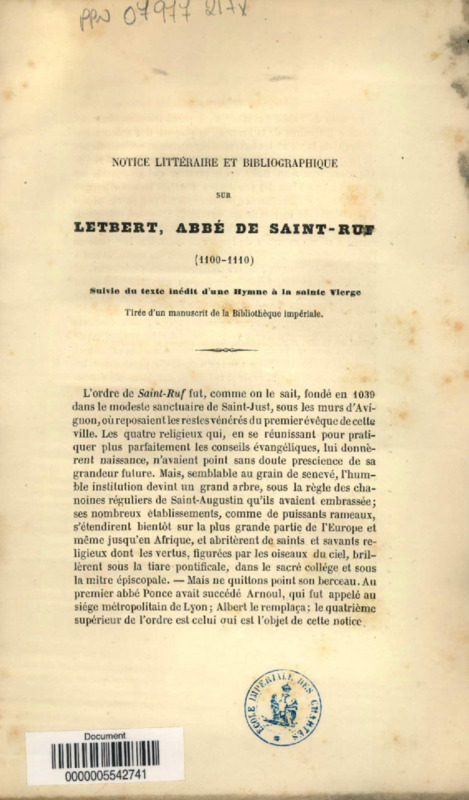 Notice littéraire et bibliographique sur Letbert, abbé de Saint-Ruf (1100-1110), suivie du texte inédit d'une hymne à la Sainte Vierge tirée d'un manuscrit de la Bibliothèque impériale