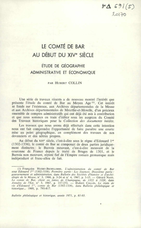 Le comté de Bar au début du XIVe siècle : étude de géographie administrative et économique