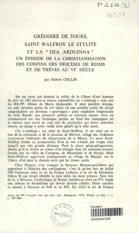 Grégoire de Tours, Saint Walfroy le Stylite et la "Dea arduinna" : un épisode de la christianisation des confins des diocèses de Reims et de Trêves au VIe siècle