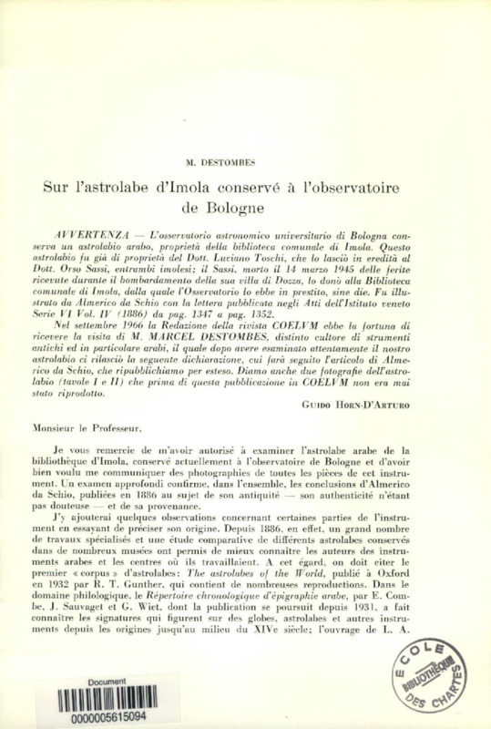 Sur l'astrolabe d'Imola conservé à l'observatoire de Bologne