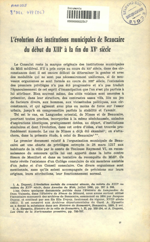 L'Evolution des institutions municipales de Beaucaire du début du XIIIe à la fin du XVe siècle