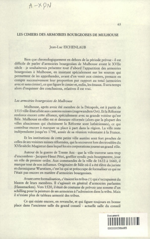 Les Cimiers des armoiries bourgeoises de Mulhouse