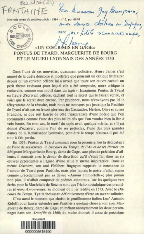 "Un coeur mis en gage" Pontus de Tyard, Marguerite de Bourg et le milieu lyonnais des années 1550