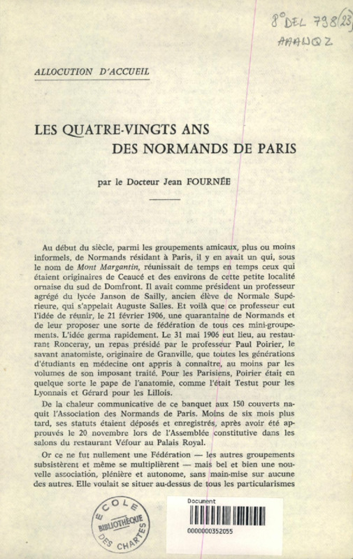 Les quatre-vingts ans des Normands de Paris : allocution d'accueil
